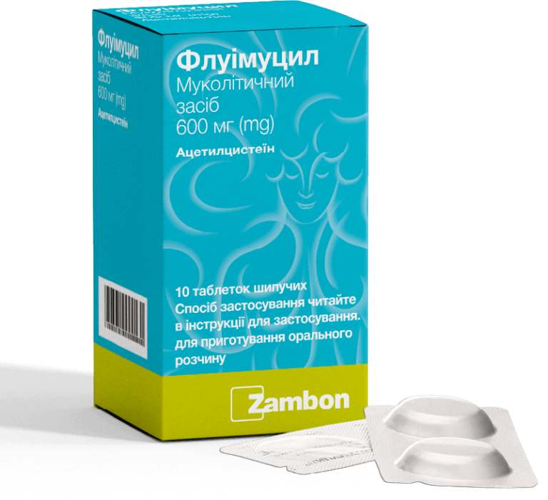 Флуімуцил таблетки по 600 мг N-ацетил-L-цистеїн (АЦ) чинить виражену муколітичну дію на слизовий і...