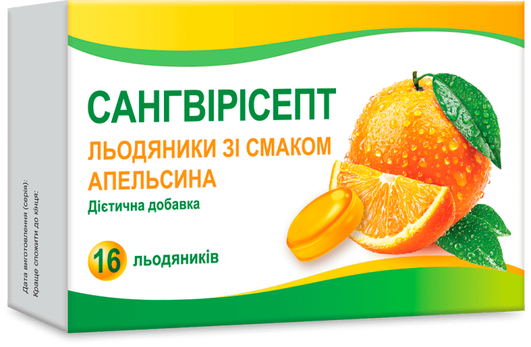 Льодяники Сангвірісепт зі смаком апельсину сприяють нормалізації функціонування слизової оболонки горла та гортані.